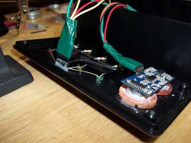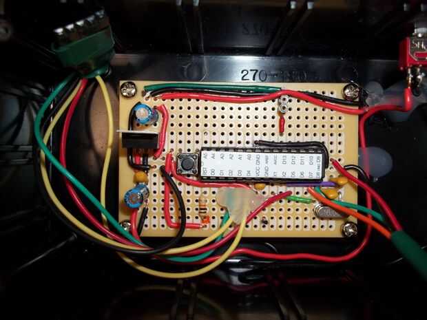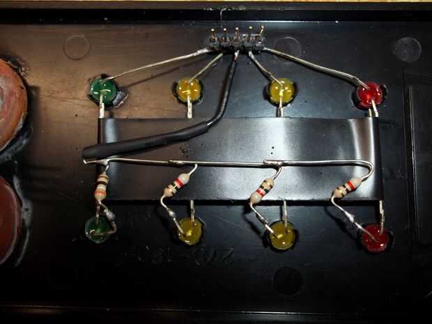Trabajando en el interior de la tapa: se sueldan los LEDs: rojo en serie; amarillo-amarillo en serie; amarillo-amarillo en serie; verde en la serie, junto con las resistencias (4) como se menciona en la lista de materiales: (100 Ohm para rojo y amarillo y 82 Ohm para verde). Me olvidé del encogimiento del calor hasta que el LED conectado, envolvió un trozo de cinta aislante a su alrededor y había colocado del encogimiento del calor sobre el cátodo común. Yo había soldado entonces todos estos conduce a la cabecera de macho 5 pin de fila. Nota: usando el pin del centro para la tierra (-), si conectarlo al revés, que todavía funciona. Luego se aplicó una buena tira de pegamento caliente para fijar la cabecera de la tapa. (Foto 1)