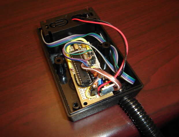 Perfore un agujero en su interior que puede caber el convoluto. Lo hice mediante un enfoque de ensayo y error a partir de un tamaño pequeño y aumentando el diámetro hasta el tubo de ajuste justo. Instale los cables por el orificio y luego oprima en el convoluto. Mis cables son un poco largos así que tuve que doblar alrededor para caber. Algunos Velcro sostiene la placa de circuito al gabinete.