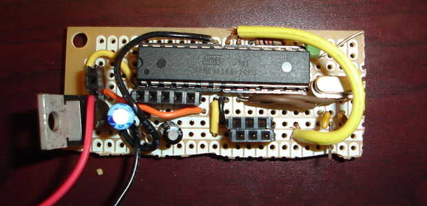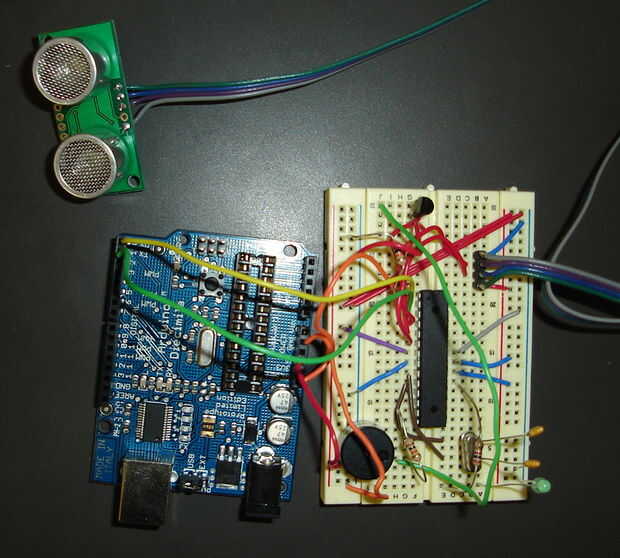 He incluido la foto de la versión de la tarjeta de PC (con sensor y timbre desconectado) así como una versión de prototipo construido en un protoboard para referencia. La versión de protoboard también muestra cómo se conecta la placa Arduino como programador para el chip microcontrolador USB. Ya utilicé un zócalo DIP para el chip, también puedo quitar el chip y ponerlo en una placa de Arduino para programarlo, pero puede ser difícil de extraer el chip sin doblar todos los bolos, por eso incluí los pines header hembra para tx/rx. Aunque la Junta es muy estrecho, puede ver que todos los pines del controlador tienen un pad de soldadura disponible para conectarse. Puesto que no son necesarios para este proyecto no soldadura de encabezados femeninos a los pines sin usar, pero si lo fueran, tendría todas las capacidades de un Arduino Diecimilia excepto a bordo USB en un paquete muy pequeño. El ancho de la Junta es aproximadamente una mitad de la Junta Diecimilia y sobre la misma longitud. (aquí hay una similar configuración). Es opcional utilizar un transistor para encender el zumbador, el Arduino puede proporcionar suficiente corriente desde el perno sí mismo. Sin embargo, utilizando el transistor permite utilizar otro sonido que dispositivos diferentes a un zumbador si tienes uno.