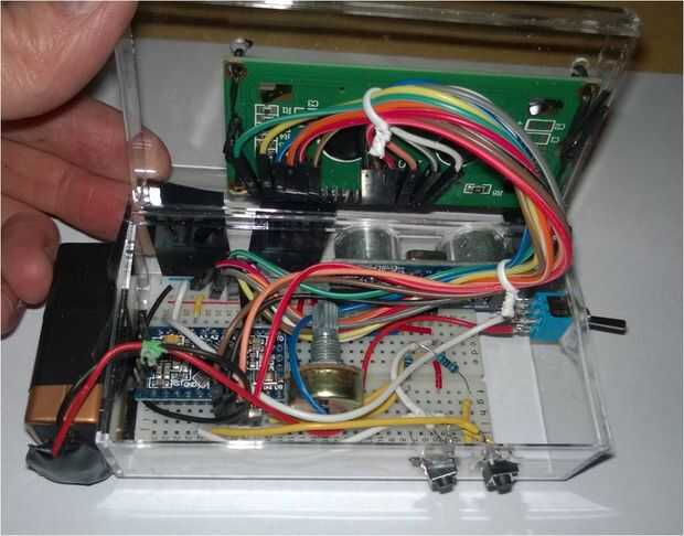 La Asamblea fue una de las partes más difíciles porque hay tanto para caber en un área relativamente pequeña. Al final tuve que doblar las patas en la pantalla LCD para que fueran paralelos a la parte posterior de la pantalla LCD y mover la pila de 9V al exterior de la caja. Utilizando un cable de conexión para algunas de las conexiones de la placa en lugar de más cables Dupont y pude ahorrar algo de espacio usando lazos de torcedura en los cables de la pantalla LCD. También terminó la conmutación hacia fuera de la maceta mas grande de k 50 para un bote k 10 con un formato más pequeño. Una vez que todo el cableado fue hecho y todo estaba en su lugar el caso ya no cerrar todos lo usé cinta aislante para sujetar que él firmemente cerrado.