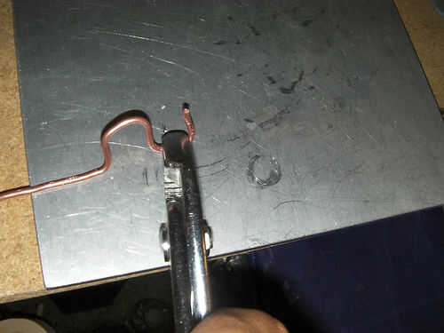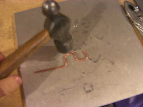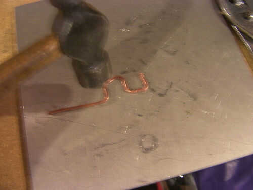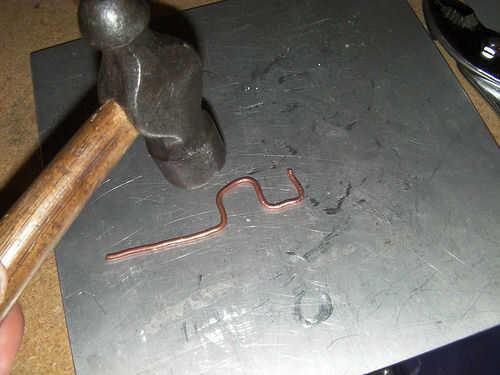 En primer lugar, con sus pinzas, doble el alambre de cobre en forma de zig-zag, con al menos 3 curvas. Esto se utilizará para conectar a la parte plana de su altavoz de batter funcionado (mina fue situado en la unidad de masa). A continuación usando su martillo metal, libra el alambre de cobre doblado hasta que el metal se puede colocar plana hacia abajo.