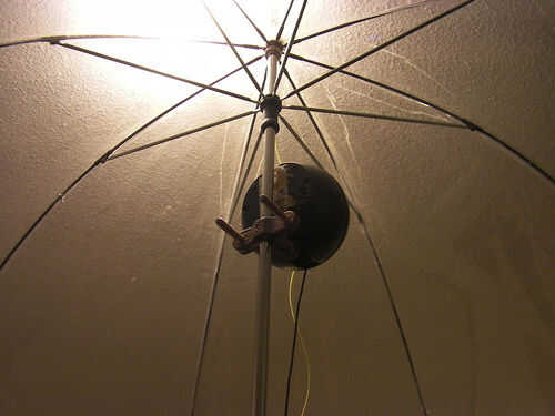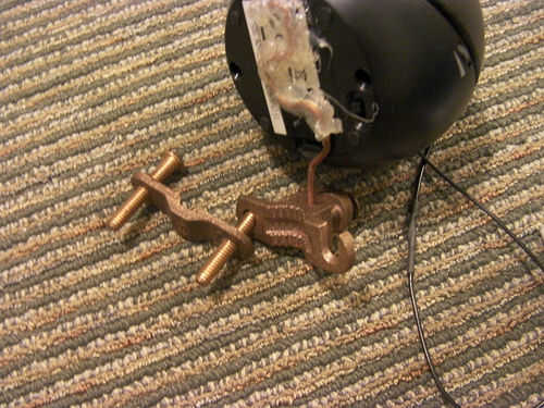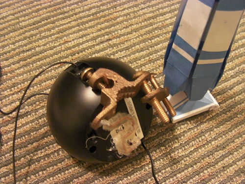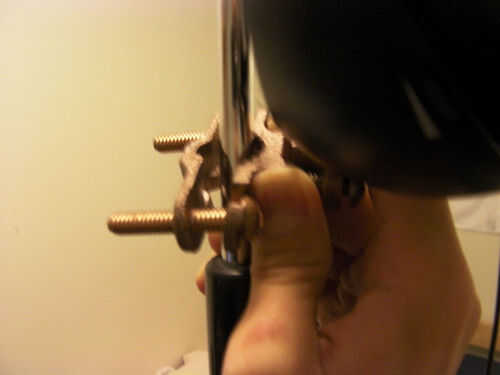 En primer lugar, fije la Abrazadera de latón al Alambre de cobre grueso, utilizando un destornillador para apretar el perno de tornillo. A continuación, fije la abrazadera de latón a la varilla de paraguas de metal y apriete a mano las pinzas junto como no quiere doblar la varilla de paraguas. Asegúrese de que el altavoz se coloca por lo menos 5 pulgadas de la parte superior de la sombrilla, para maximizar el espacio de sonido de la umbrelAudio.