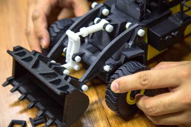 con un niño enamorado de vehículos de todo tipo, surgió con el diseño de cargador frontal se muestra al pensar en el regalo perfecto. Láser corte de 1/8" multilaminada de abedul báltica con unas espigas de ejes y pivotes y celebró junto con pegament