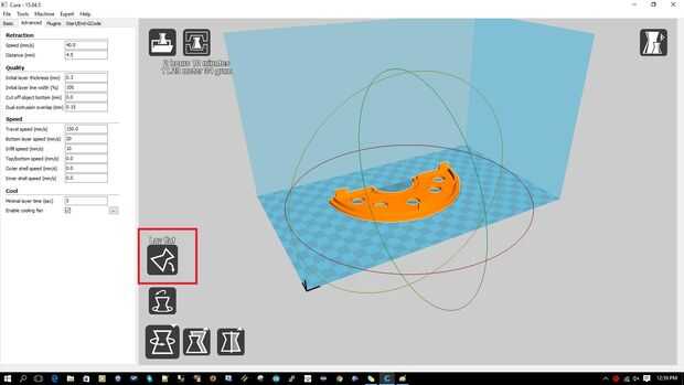 - Una vez que el modelo se carga en Cura, utilizar la Endecha plana característica de la herramienta rotar