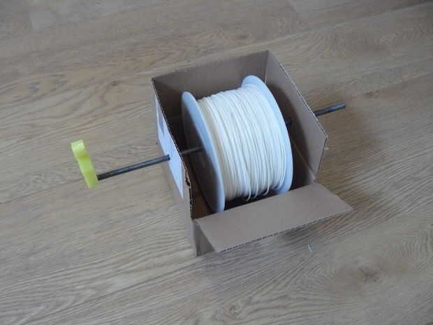 Consejo, si un carrete es demasiado grande para caber en un estándar hasta soporte para carretes, puede utilizar una caja y un pedazo de varilla para hacer tu propio soporte para carretes personalizados.