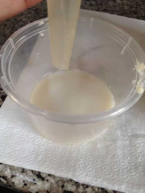 PIC 4) pone un guante en el embudo y lazo doble banda elástica para comprimir el aire a través de puré y suelte líquido. Podría utilizar un colador de té y una cuchara en su lugar!!!!!! Como líquido es muy viscoso...