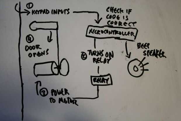 Si el código es correcto, el relé se activa durante 5 segundos. El motor entonces es alimentado directamente por la fuente 12V, que da vuelta a la manija de la puerta, abrir la puerta.