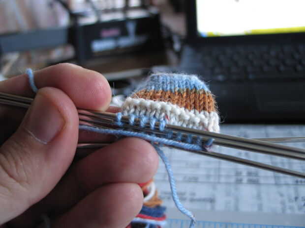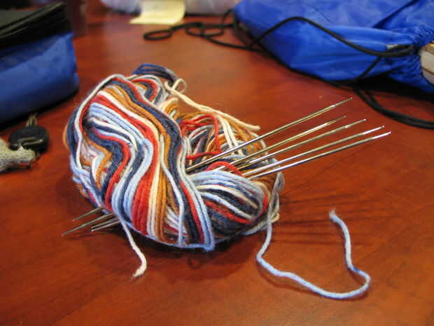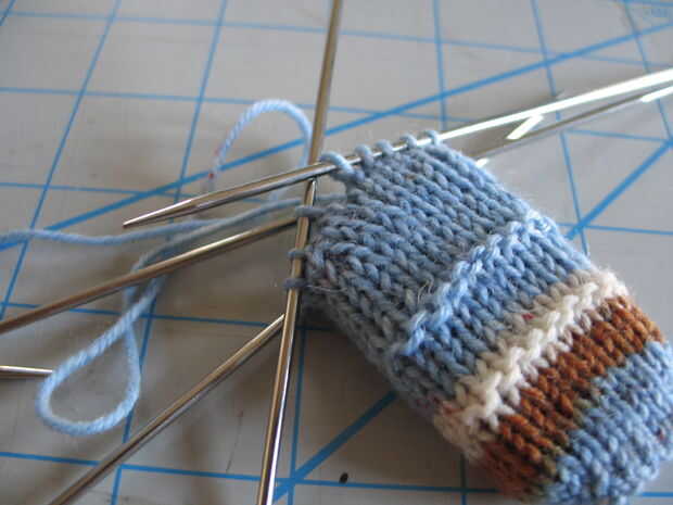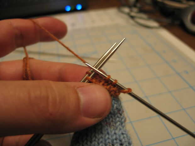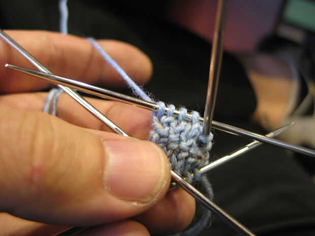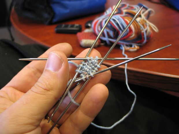 - Al llegar a cuatro puntos de sutura en cada uno de aguja, dos punto juntos a través de dos agujas, luego tejer ida y vuelta en punto jersey por sobre cuatro o cinco filas. Terminan en una hilera del derecho.