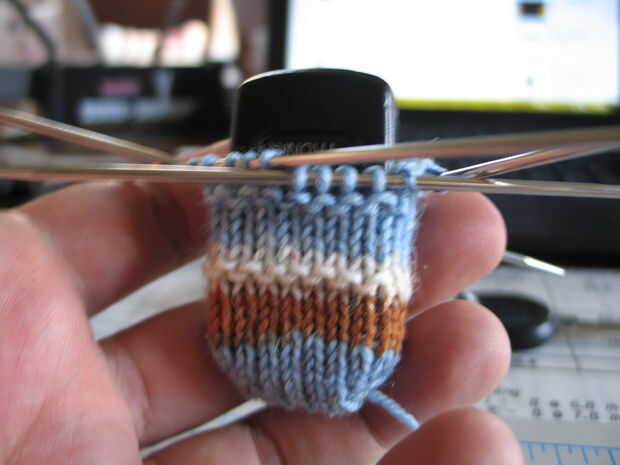 - Usé hilo Self-striping. No estaba contento con el aspecto de la amplia franja de luz azul, así que tomó el azul más oscuro de más en la madeja y utiliza puntada duplicada para hacer líneas de demarca la ubicación del botón. No tengo una foto de la nueva, pero puedes ver lo que parece la puntada duplicada en el antiguo fob gastado.