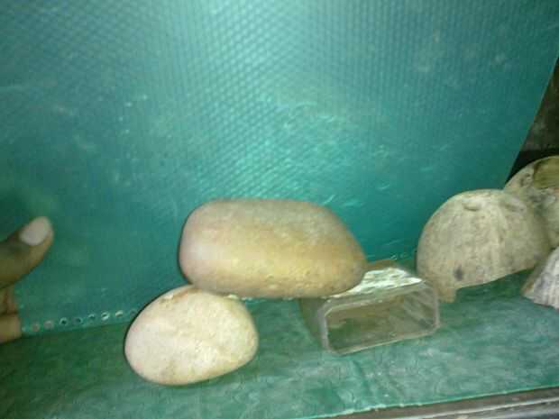 AHORA TOMA LAS PIEDRAS Y COLOCA LAS DOS PIEDRAS MEDIANAS EN LA CAMA DE LA GRAVA Y EL GRANDE EN LAS 2 PIEDRAS DE LAS CUEVAS