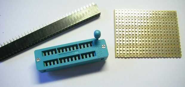He usado una estrecha 28 pines DIP cero fuerza de inserción toma, similar a la famosa marca Textool, pero etiquetado como TFXTDOL. Para un zócalo de 28 pines necesita dos tiras largas de 28 pines de la cabecera de la mujer. Para la conexión a la cabecera ISP10PIN el STK500 necesita otro dos piezas de 5 x 2 contactos.