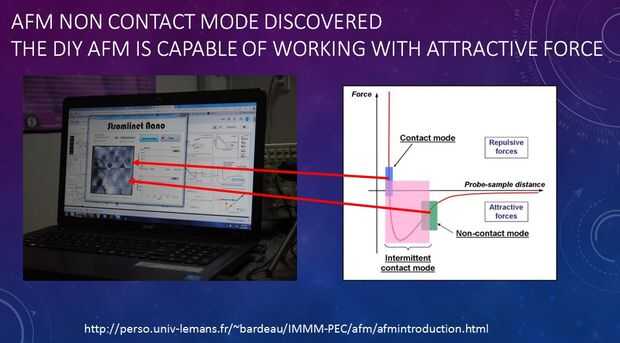 Sorprendentemente encontramos que la AFM DIY puede trabajar con el modo sin contacto (interacción atractiva entre los átomos causada por fuerzas de van-der-Waals) que tiene la característica de altura de 1,4 nm en el TGQ1.