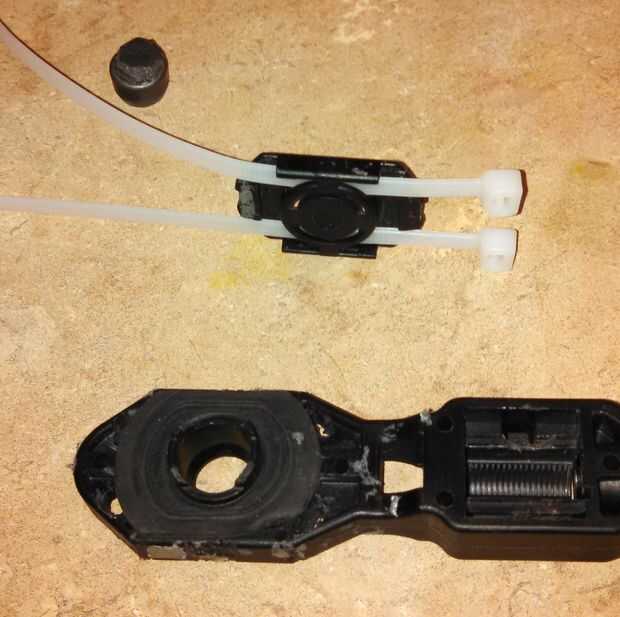 Originalmente fue un clip de U que se deslizó en estas ranuras en la placa de fondo, atrapando las bridas (ahora rotas lejos) de la manga centro y mantiene las piezas juntas. Para esta solución, esencialmente estamos reemplazando el clip de U con los lazos del cierre relámpago.