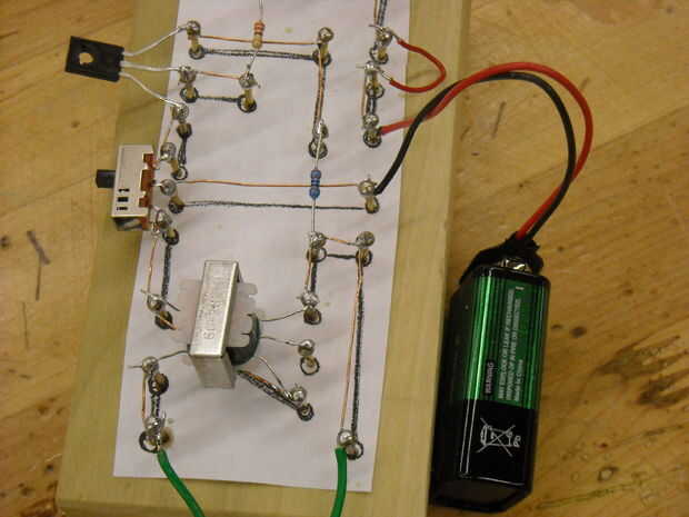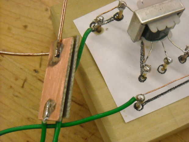 Corte el alambre a unos 6" de largo de ayudar a los niños a formar un lazo en un extremo. Algunos niños parece realmente complicado. Soldadura preparación final sin un circuito de soldadura a la placa de cobre. Revisa las fotos de esclarecimiento. Es importante que la almohadilla de cobre de la soldadura con la punta de prueba de la uña inferior... recuerden que es un interruptor... le permite aplicar un voltaje positivo al ZAP o el SCR.