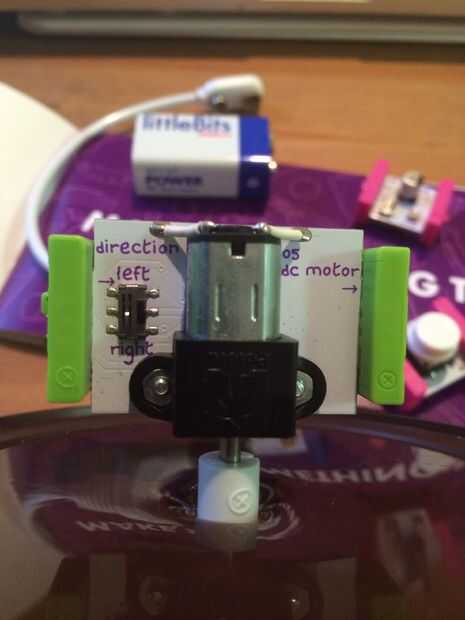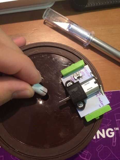 Poner el mate Littlebits Motor a través del agujero se corta solo. Si es demasiado pequeña, el agujero un poco más grande, pero más pequeño es mejor que el más grande.