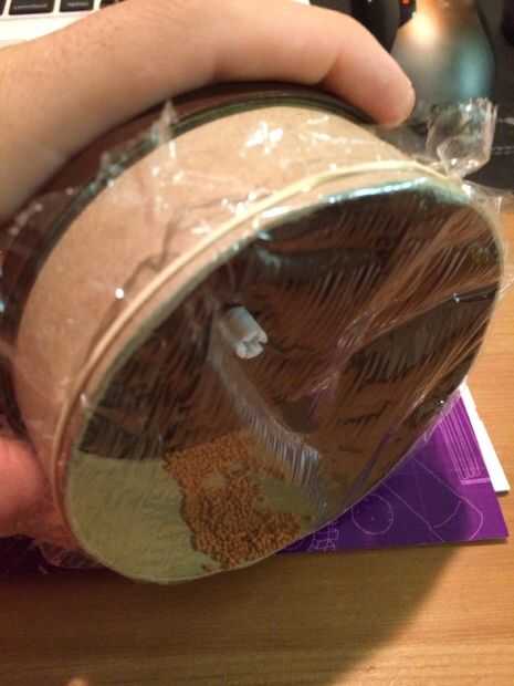 Poner unas dos semanas vale de alimentos de peces dentro de su alimentador de peces Littlebits un botón. * Nota * no poner demasiado en. Cubrir el extremo abierto en papel de aluminio o plástico. Envuelva la banda de caucho alrededor del tubo para detener la comida se derrame hacia fuera.