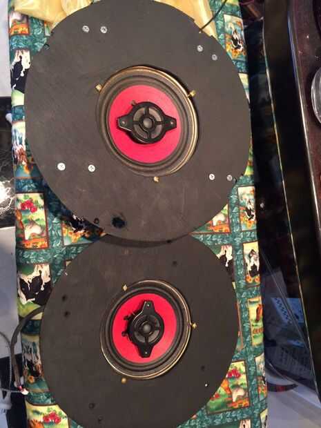 Lo primero que empecé con fueron los oradores que corté dos piezas de madera contrachapada en discos para el gabinete y los agujeros para los altavoces. Me fijo el primer orador en el gabinete y luego creé a separadores con los listones de madera para colocar el segundo disco de madera contrachapada. Los ponentes fueron hacia atrás y llenaron el espacio con ningún espacio entre los altavoces. Después de todo, montar I desmontar los altavoces y pintado los discos... Esta es la parte fácil.