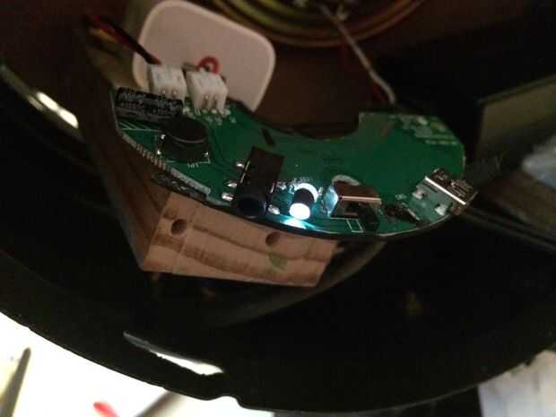 Desmontar el altavoz bluetooth, quite el altavoz. Los cables del altavoz será la salida del amplificador. Tenemos el interruptor de encendido para ser operacional desde fuera del armario y por cable hasta. Soy detestan para quitar los componentes de un circuito, puede ocurrir todo tipo de problemas por lo que prefiero soldar los cables donde sea posible y conectar mi propio hardware. Rompió abierto el interruptor, encontré las lengüetas y soldar 2 cables que fueron para mi nuevo interruptor on/off, probado para asegurarse de que el nuevo interruptor trabajó con el bluetooth. Es necesario que vuelva a conectar el LED por lo que se puede ver fuera del armario. Para esto simplemente cortar las patas del LED hasta la mitad, así que tienes que soldar los cables a. La soldadura de tres cables al LED y a la PCB. Es un LED azul y rojo pálido. El pálido azul LED parpadea cuando no está conectado a un dispositivo bluetooth, brilla sólidamente cuando se conecta y va rojo cuando se está cargando. Conecte la entrada USB para el cargador USB. Conectar el Walwart al amplificador. Conecte los cables de altavoces (salida de bluetooth) a un enchufe de 3,5 mm y enchufe en la toma AUX de amp. Luego conecte los altavoces del coche en el amplificador.
