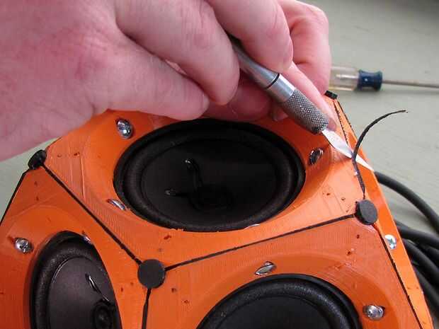 Tuerza los cables blanco libres de los grupos junto con el blanco de plomo de los cables y asegure con una tuerca para alambre. Hacer lo mismo con los conductores rojos. Esto completa el circuito de altavoces. Envuelva las tuercas para alambre, juntos, con unas vueltas de cinta aislante. Esto proporciona fuerza adicional mecánica y ayudar a mantener las tuercas de traqueteo dentro del gabinete.