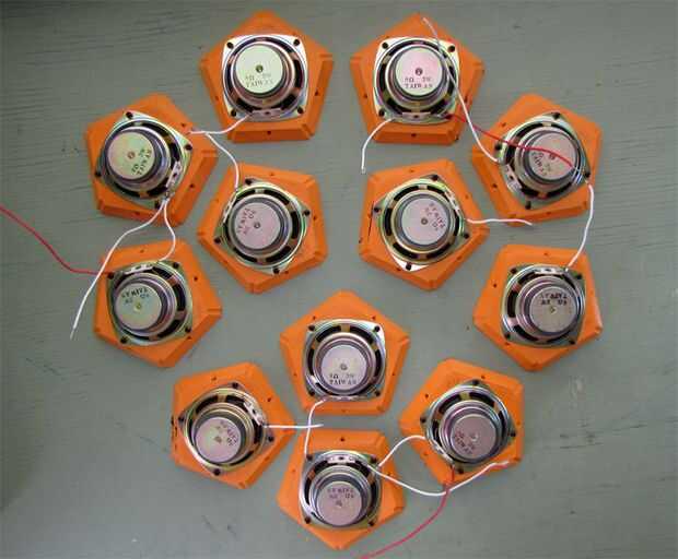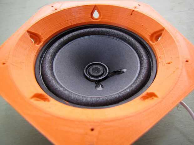 Después del primer módulo de la impresora, limpie cualquier flash, genera u otras imperfecciones de la superficie con un cuchillo de la manía aguda o una llama, luego verifique el ajuste contra uno de los altavoces. El cono debe encajar en el hueco central limpiamente, y debe poder girar el altavoz que los cuatro agujeros de montaje en la parte inferior del módulo se alineen con los cuatro agujeros de montaje en la brida del altavoz. Si el altavoz se ajusta, imprimir los restantes once módulos que el anterior. Tómese un minuto para revisar cada módulo contra un altavoz derecho después se imprime, en caso de algo salga flojo con su impresora entre la impresión primera y la última