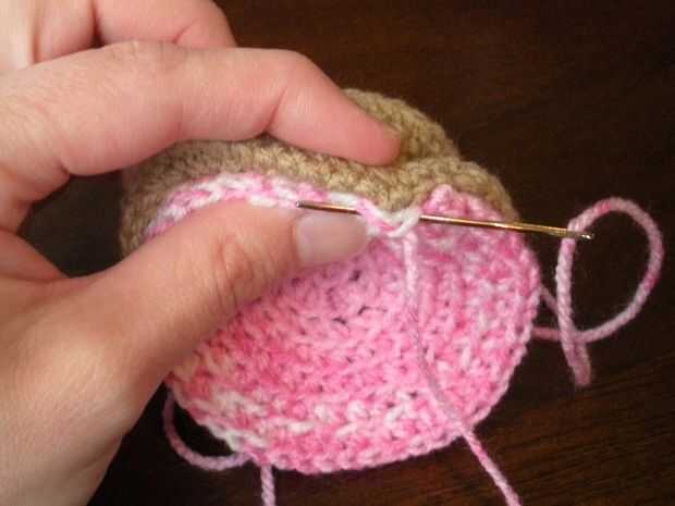Paso 3: Coser la guinda en la parte superior de la torta base con un poco de hilo en color guinda. Para asegurarse de que sus puntos son invisibles desde la parte inferior de la Magdalena, coser a través de sólo la guinda y alrededor 15 de la base del pastel como se muestra a continuación. Coser todo alrededor dejando aproximadamente una pulgada de hielo plegada de modo que usted puede rellenar el cupcake.