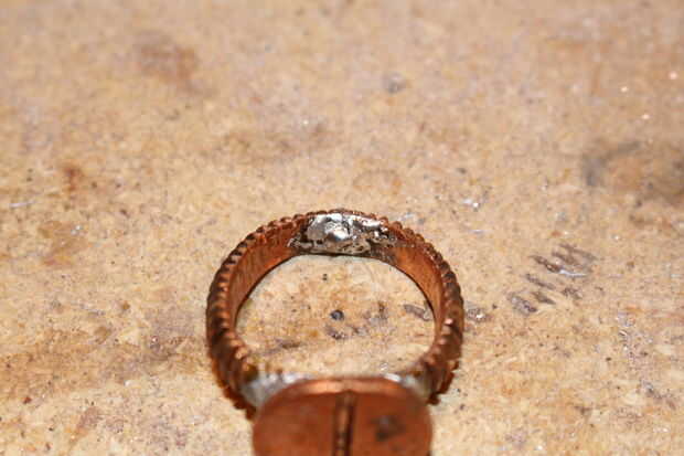 Una vez que tenga un anillo de igual forma, puso el anillo en el dedo estará adornando y marca donde debe cortar. Utilicé un disco de corte. Vuelva a colocar el dedo para comprobar el tamaño. Corte más según sea necesario, o estirarse para caber; puede llenar el vacío con soldadura.