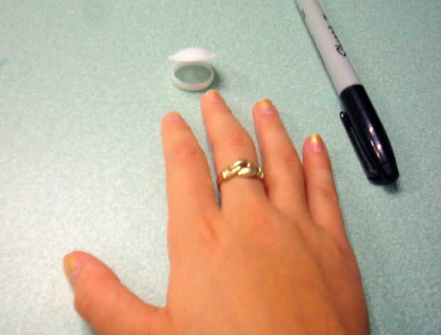 Necesita la cáscara pequeña tapa bajo el giro de la tapa de un cartón de leche (limpios), un rotulador (marcador permanente) y 1 mano o un dedo para poner el anillo.
