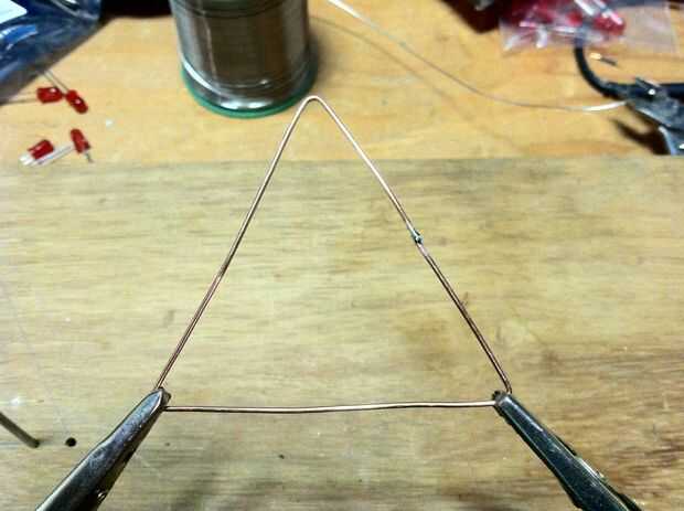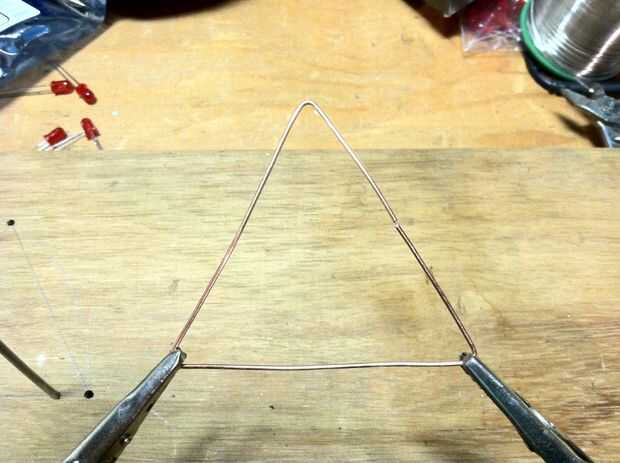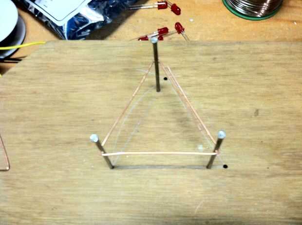 me decidí a hacer el árbol con cinco capas y un solo LED blanco en la parte superior. Esto significaba que tenía que construir 5 seis caras estrellas para apoyar las diferentes capas. Me decidí por una base 8 cm a través de que implicaba que las estrellas deben disminuir alrededor de 1,3 cm por capa. Entonces medido hacia fuera de un triángulo equilátero de 8 cm en un pedazo de madera dura y condujo en tres clavos en los vértices. Yo entonces doblado algunos alambre de mediano calibre de cobre alrededor de los clavos para formar un triángulo. Me corte el exceso de alambre y soldar los dos extremos juntos.