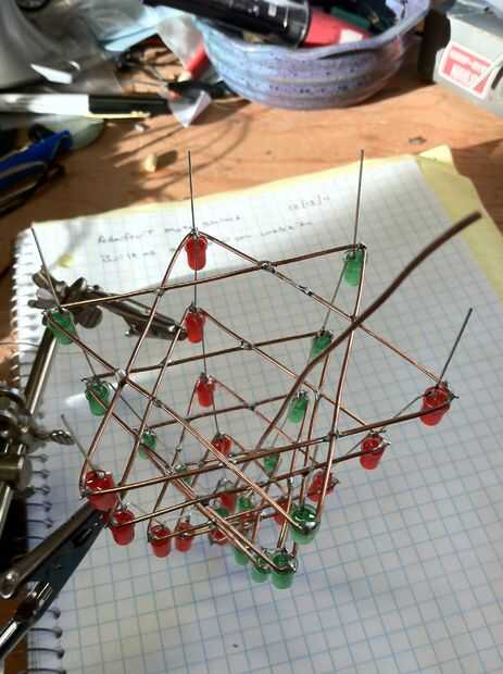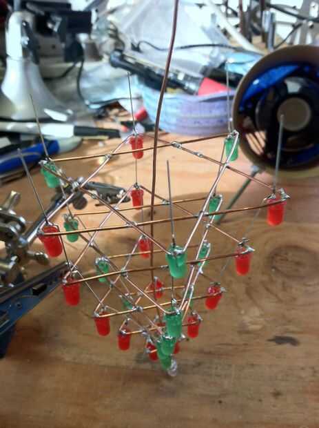 Soporte LED blanco por encima de la capa superior del árbol. Su cátodo a cátodo de uno de los seis LEDs de la capa superior de la soldadura. Deje sin conectar el ánodo por ahora.