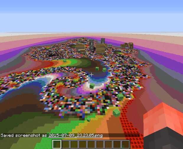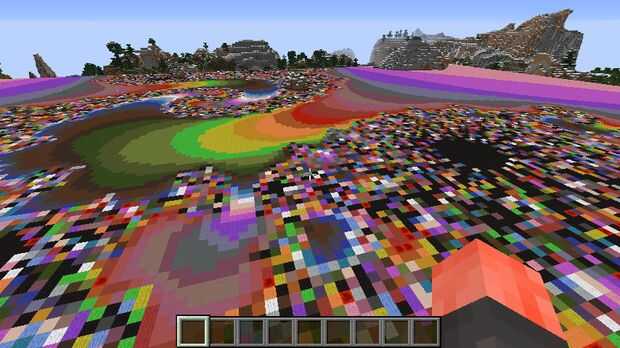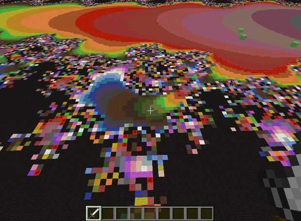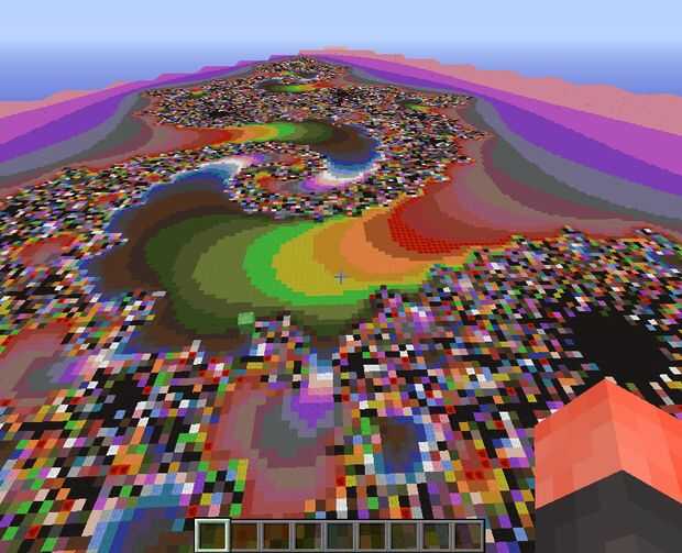 mientras que de pie en el suelo de un mundo plano (o volando en el aire sobre un menor plano mundial) genera un colorido conjunto de Mandelbrot . El área que está en el comienzo es de color negro. Sólo mosca o ejecutar y pondremos a algunas regiones coloridos.