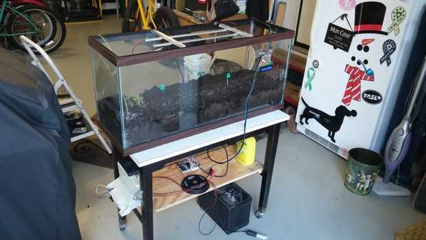 ACTUALIZACIÓN (10/09/15): después de construir el proyecto me mudé a mi piso, que está en la 9ª planta. Desafortunadamente, las ventanas tienen un UV especial (o algún tipo de longitud de onda) del tinte que reduce mi tarifa de la energía de panel solar con un factor de 10. En otras palabras, el panel es inútil con estas ventanas. Explícitamente no estoy autorizado para colgar cualquier cosa, como el panel solar, fuera de mi ventana de acuerdo con mi contrato de arrendamiento, por lo que a partir de ahora el proyecto está en suspenso hasta que puedo moverlo en otra parte. Pero la lechuga crece muy bien, como yo he sido riego por mi cuenta puesto que la batería ha muerto. Así que el tanque funciona bien!