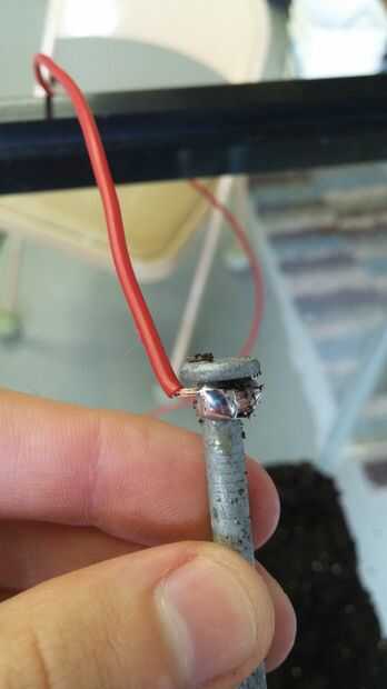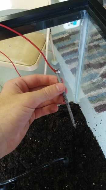 Guardé las cosas simple aquí. Que soldar cables directamente a dos clavos galvanizados y había pegado en extremos opuestos del tanque. Utilizar un montón de soldadura aquí para asegurarse de que tienes una conexión buena y fuerte. El Arduino Lee entonces la resistencia entre los dos clavos y así la resistencia del suelo, para determinar cuánta humedad en el suelo. Luego se decidirá si necesita encender la bomba riego en base a estas lecturas de humedad.