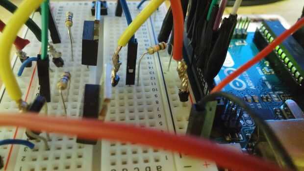 Un clavo está conectado directamente a la fuente de alimentación de 5V de Arduino, y el otro está conectado a tierra a través de un resistor de 10K así no demasiado corriente fluye al Arduino. El cable azul en la imagen va a un pin analógico en que se lee la resistencia entre las dos clavijas.