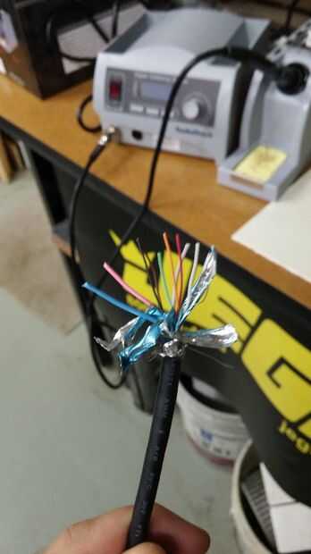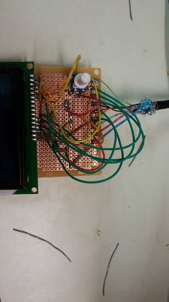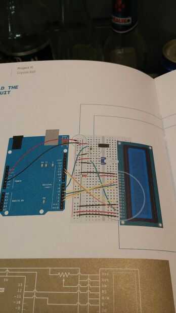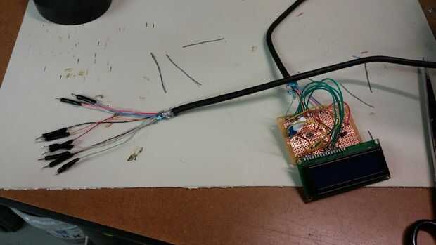Para conectar este circuito a la placa y Arduino, usé y equipo antiguo cable del monitor. Una vez más, sólo tiene que utilizar lo que tienes ahí! Se sorprenderá de cómo se puede reutilizar "basura". Cortar el extremo del cable para desnudar los alambres, luego soldar los cables a mi placa (la pantalla utiliza bastantes cables!). Más o menos seguí el esquema del libro de kit de arranque para conectar la pantalla LCD.