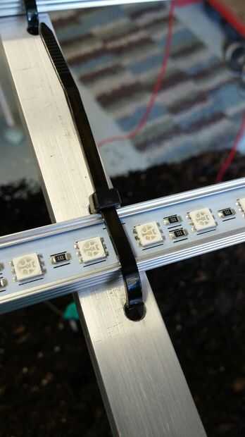 Usando algunos chatarra tirada por ahí, he creado un simple apoyo para las luces colgar de. Usa zip lazos para fijar las luces a las barras de metal.
