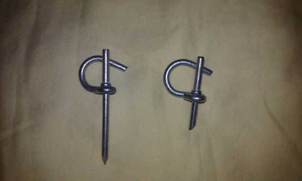 La parte más difícil era conseguir ganchos para asegurar las luces en caso de que quería cambiar o quitar. La tienda es probable que llevar ganchos clip de plástico para soporte de cable, pero opté por unidad de anillos (anillo izquierdo en imagen) por lo que puedo quitar las luces. Pocos lugares ofrecen los anillos en línea a precios bajos (la otra variedad es el anillo de la brida, que se puede atornillar en). Martilleo la 1/2" unidad anillos sacudió mi armario jamba y yo estaba preocupado de él separando de la pared, así que corté los anillos hacia abajo con una Dremel (anillo derecha en foto) y orificios en la jamba dentro para empujar en 9 anillos en el interior del armario (3 en parte superior) y 4 a cada lado.