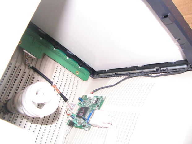 Para los filtros de luz de panel, debe haber algunos Difusor plástico papel detrás de la pantalla LCD, 3 hojas (claro, un reflectante, un blanco translúcido) y luego un gran filtro de plexiglás-como. Quité el plexiglás y todo detrás de él, sólo mantiene el 3 hojas finas de papel detrás de la pantalla LCD. Una luz detrás de la pantalla LCD brillante dio lugar a un resplandor blanco incluso