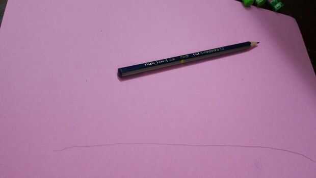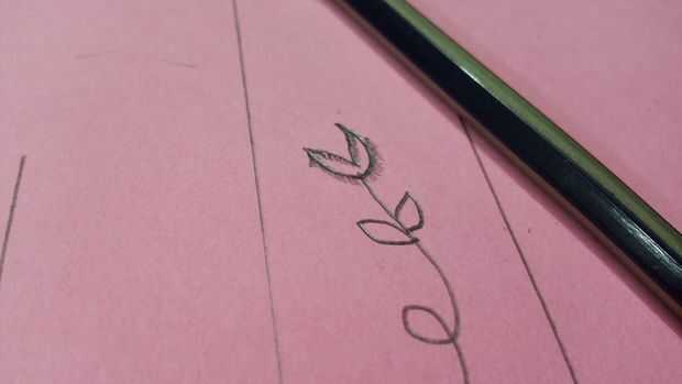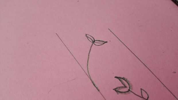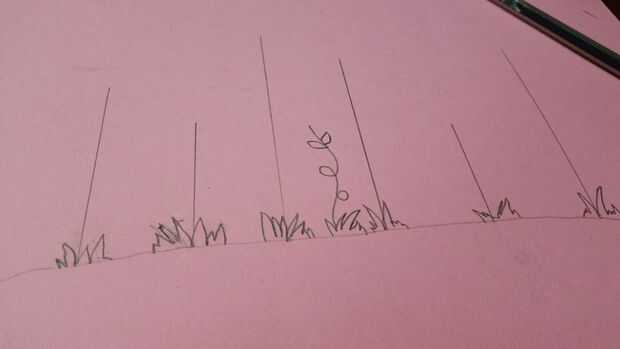 Tomar el tarjeta rosa de papel y dibujar algunas líneas, pasto y una planta poco buena diferentes en middle.like muestro
