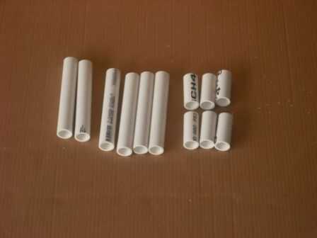 He usado una sierra para cortar tubo de PVC antes y funciona. No la diversión, pero funciona. Entonces leí un Instructable que puede cortar PVC con una mitra energía vio usando una hoja de madera estándar. Lo probé y funciona (y es divertido, también). Corto 5 x 2" longitud, longitudes de 6 x 3" y 6 x 6,5" longitudes de la tubería. Utilice el papel de lija para limpiar las rebabas de los extremos cortados de las secciones de tubería.