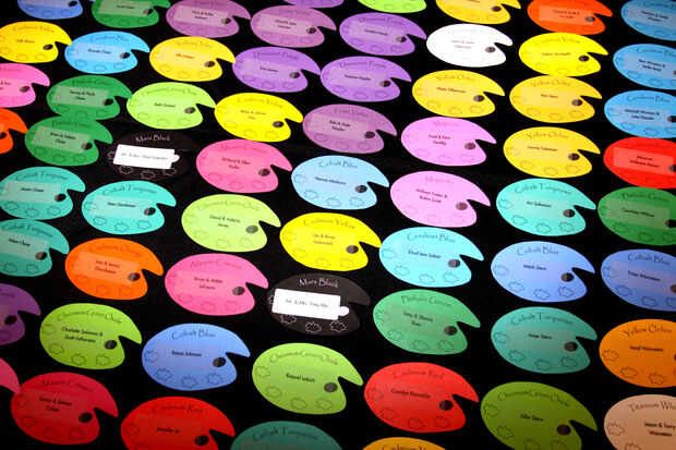 Se estos (cuantos cabrían en una página) impresión en papel de color en casa. Los colores son los mismos que las mesas van con. Nos cortan todo a mano, aunque apuesto a que si tienes una matriz de corte de la máquina va a ir mucho más rápido. Entonces nos dio las paletas, los cepillos y un gráfico de asientos al proveedor para el sistema para arriba.