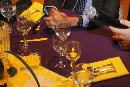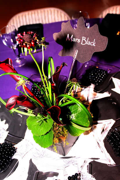 un mantel púrpura sólido como base para cada tabla (alquilado)