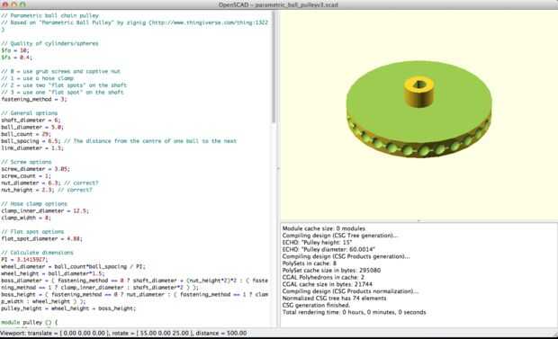 Por suerte John Abella creó un archivo de CAD paramétrico de un engranaje de cadena de la bola. El archivo debe abrirse con OpenSCAD software.