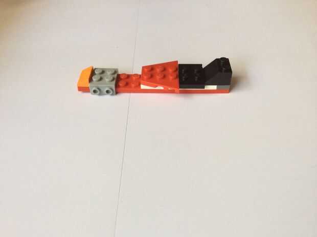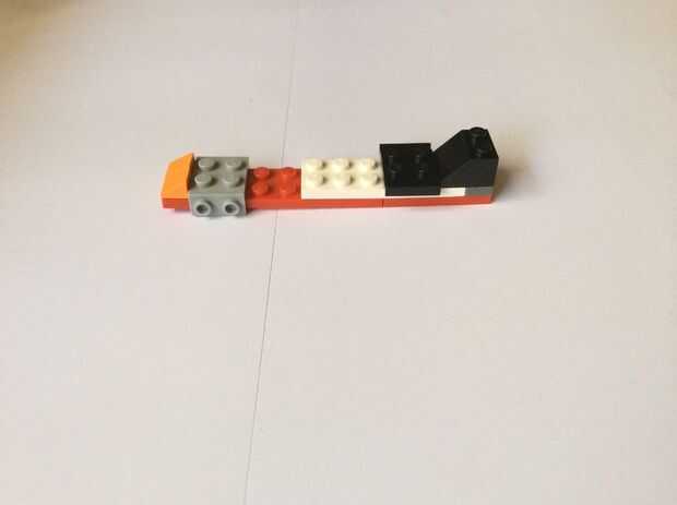Ahora añadir una pendiente de 2 x 2 en la parte posterior. En la parte delantera de la pendiente de 2 x 2 Añadir una placa de 1 x 2 con el borde único. Ahora agregar las 2 1 x 3 'alas'. Agregar una placa de 1 x 3 parte superior de las alas