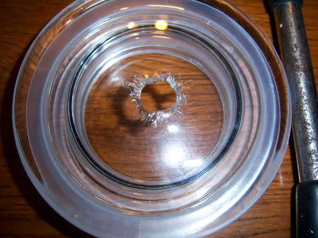 Usé el taladro puntiagudo y me colocó sobre el vidrio luego comenzó a golpee ligeramente hasta que se puso más difícil y más difícil entonces rompió un agujero, rompí un agujero más grande colocando el taladro twisty regular y golpeó duro luego me frota en los bordes como yo estaba lijado y el agujero se mantiene creciendo por lo que es como lo hice , pero asegúrese de hacerlo en un periódico para asegurarse de que el vidrio no ir a ninguna parte.