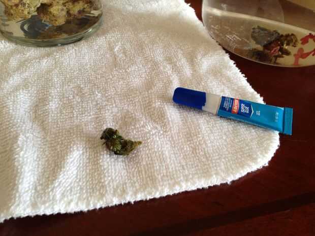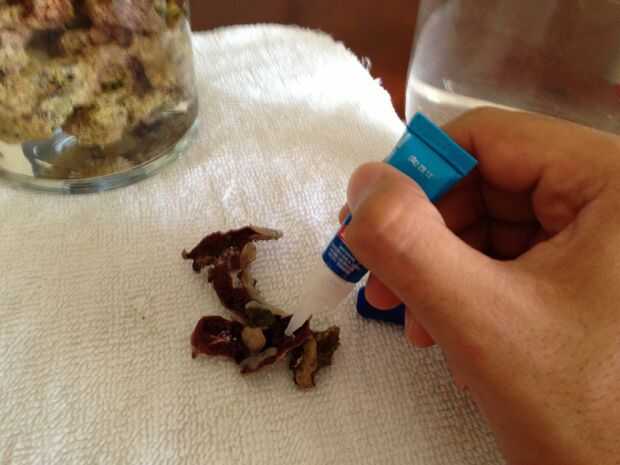 -Agregar pegamento en la parte posterior de cada coral o la roca que se fijen.