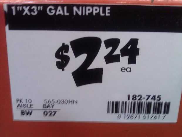 Con todo, el Banco tiene 13 pezones (4 x 6", 4 x 5", 4 x 2" y 1 x 4'), tes de 6 y 8 bridas, y todo este hardware terminó me cuesta alrededor de $200 en el Home Depot, por lo que es no precisamente barato.