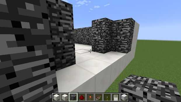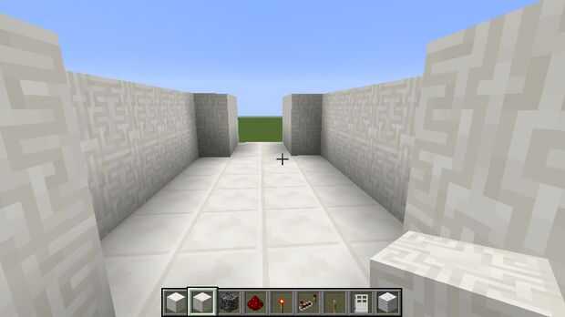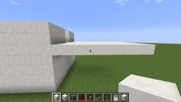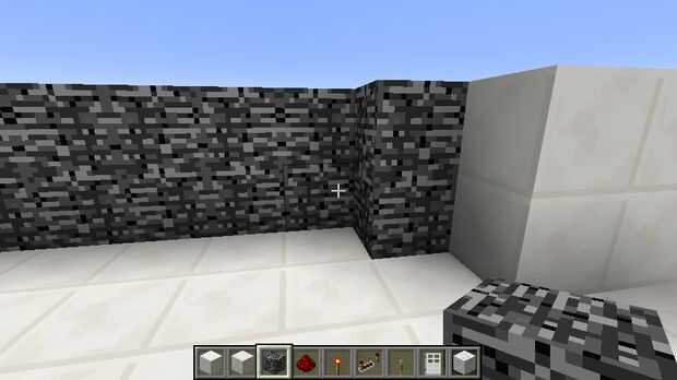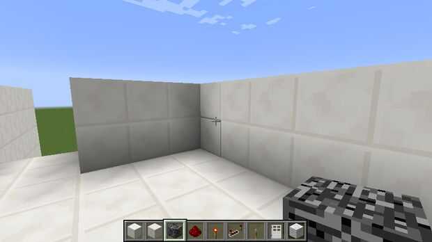 Para esta sala, todo que hizo fue poner bloques de cuarzo en el extremo de la construcción de la escalera y luego construir un muro alrededor de la planta, capa con lecho de roca (para la protección de explosión de TNT) y luego poner otra capa de cuarzo cincelado sobre la roca para ocultarla. Y también, si te estás preguntando de donde es el techo, me decidí a hacerlo último.