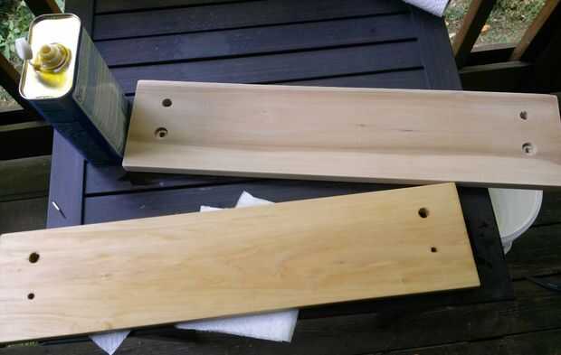 Una vez que fueron debidamente perforados y simétrica (gracias a Dios!) Les di una buena una vez con algún grano 160, golpeando cualquier bordes duros, entonces los sándwiches en algunos * cocido aceite de linaza, de mi resto de hacha: sorta kinda puede ver el color diferencial en las fotos. Los tableros fueron bastante sedientos y después de unas cuatro capas consecutivas limpiado y, después de un examen rápido ajuste, trataron con algunos fixn' cera de la escuela de conquistadores LLC. (ninguna afiliación, sólo un gran producto totalmente de acuerdo).
