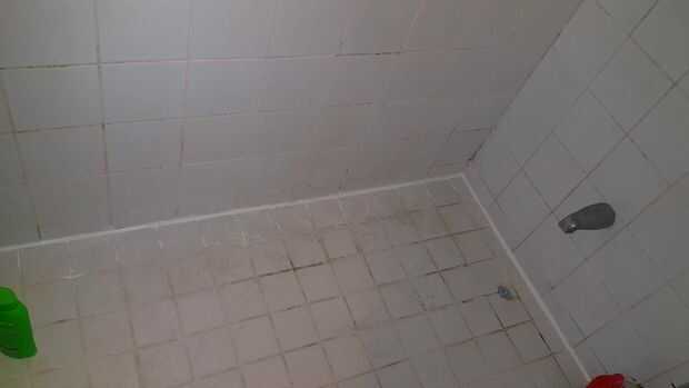 Usando un cuchillo de mantequilla (por favor no te rías) apliqué la pasta lechada en las fisuras. No hay duchas fueron permitidos para las próximas 48 horas y las fugas fueron selladas.