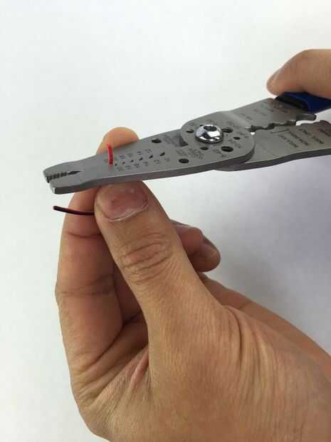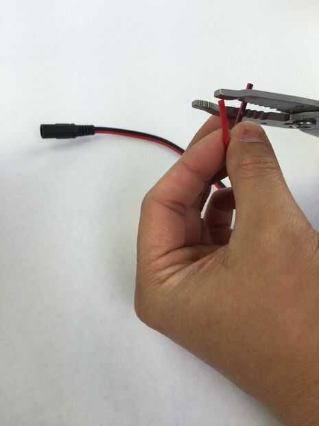Usar el pelacables, tira de los extremos de un hilo conector de 3 pines y la coleta de jack de 2,1 mm x 5,5 mm potencia.